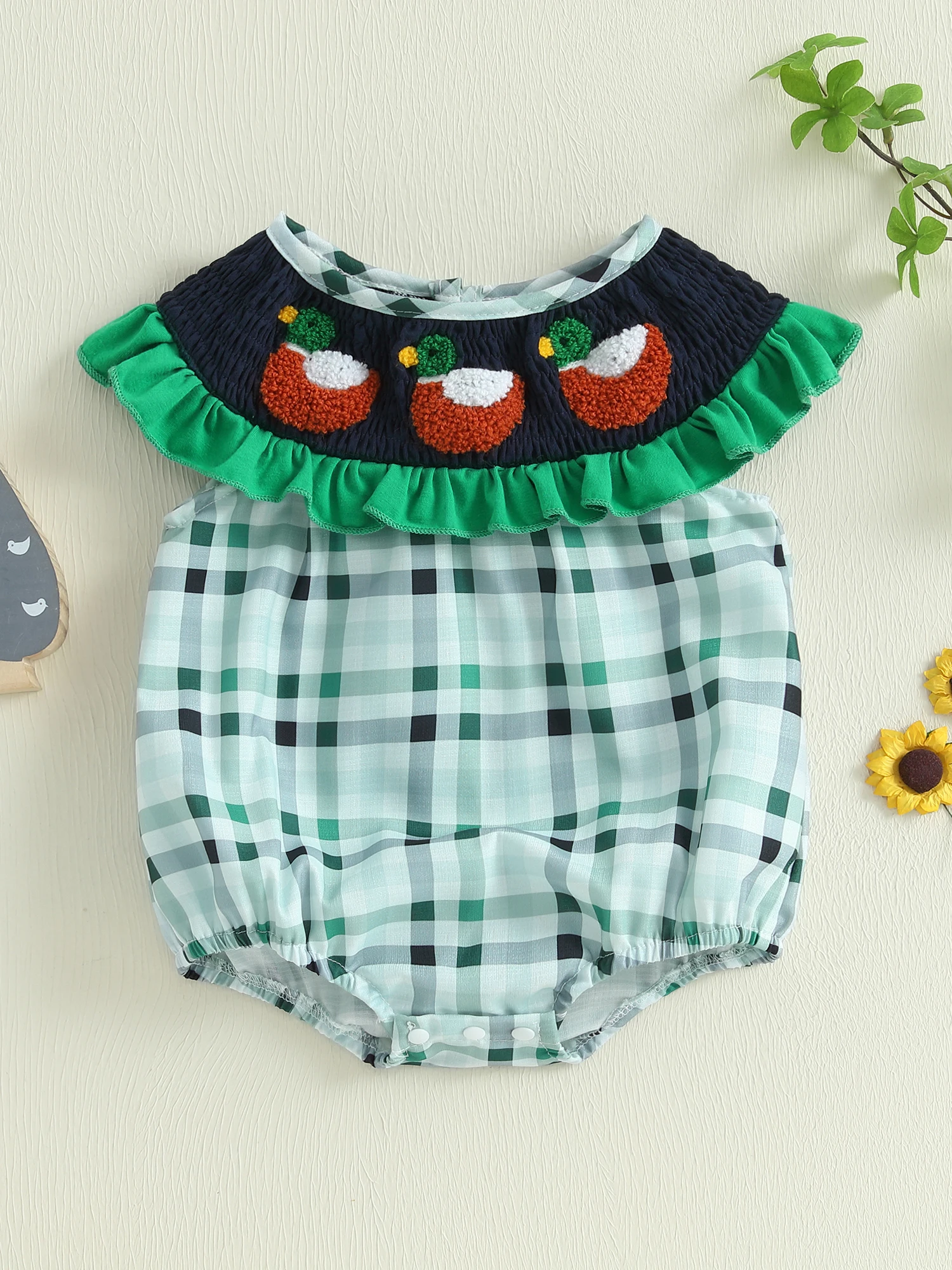 Girls Jumpsuits with Duck Embroidery and Plaid Design